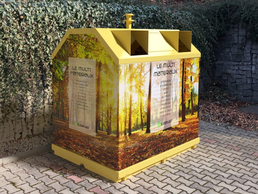The walls are made from galvanized plate and the supporting frame is hot-dip galvanized. The entire container is coated with a high-quality two-component RAL colour. The inlets on the opposite sides (glass/paper type) are protected with rubber rosette openings.